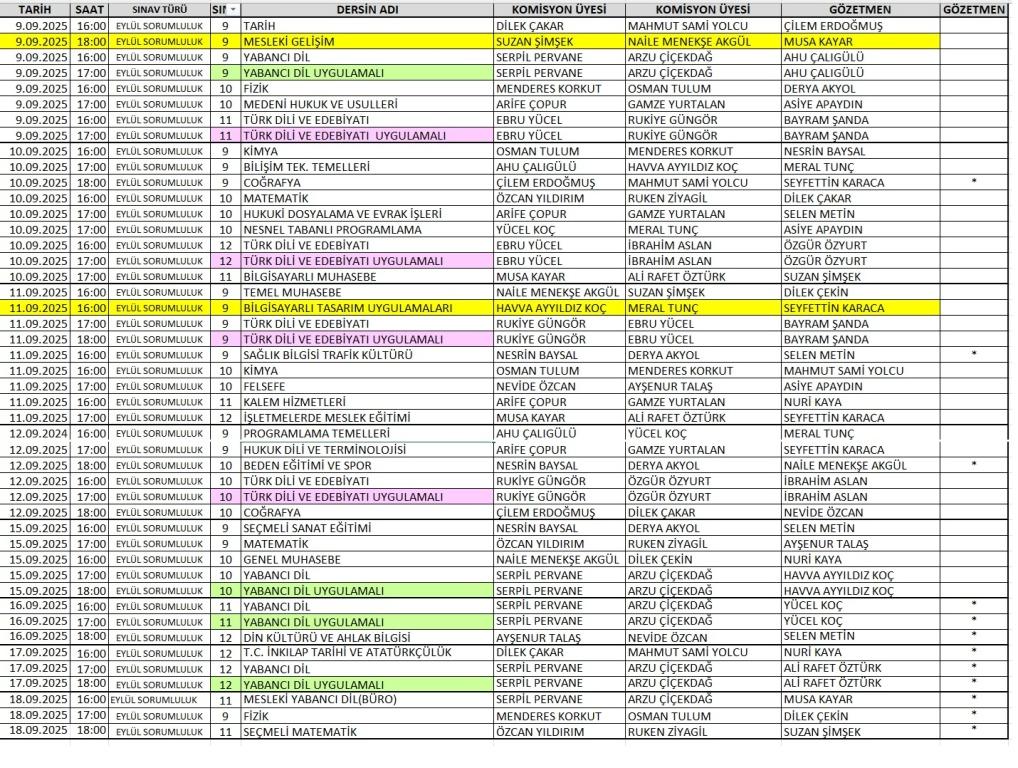 EYLÜL AYI SORUMLULUK SINAV LİSTESİ